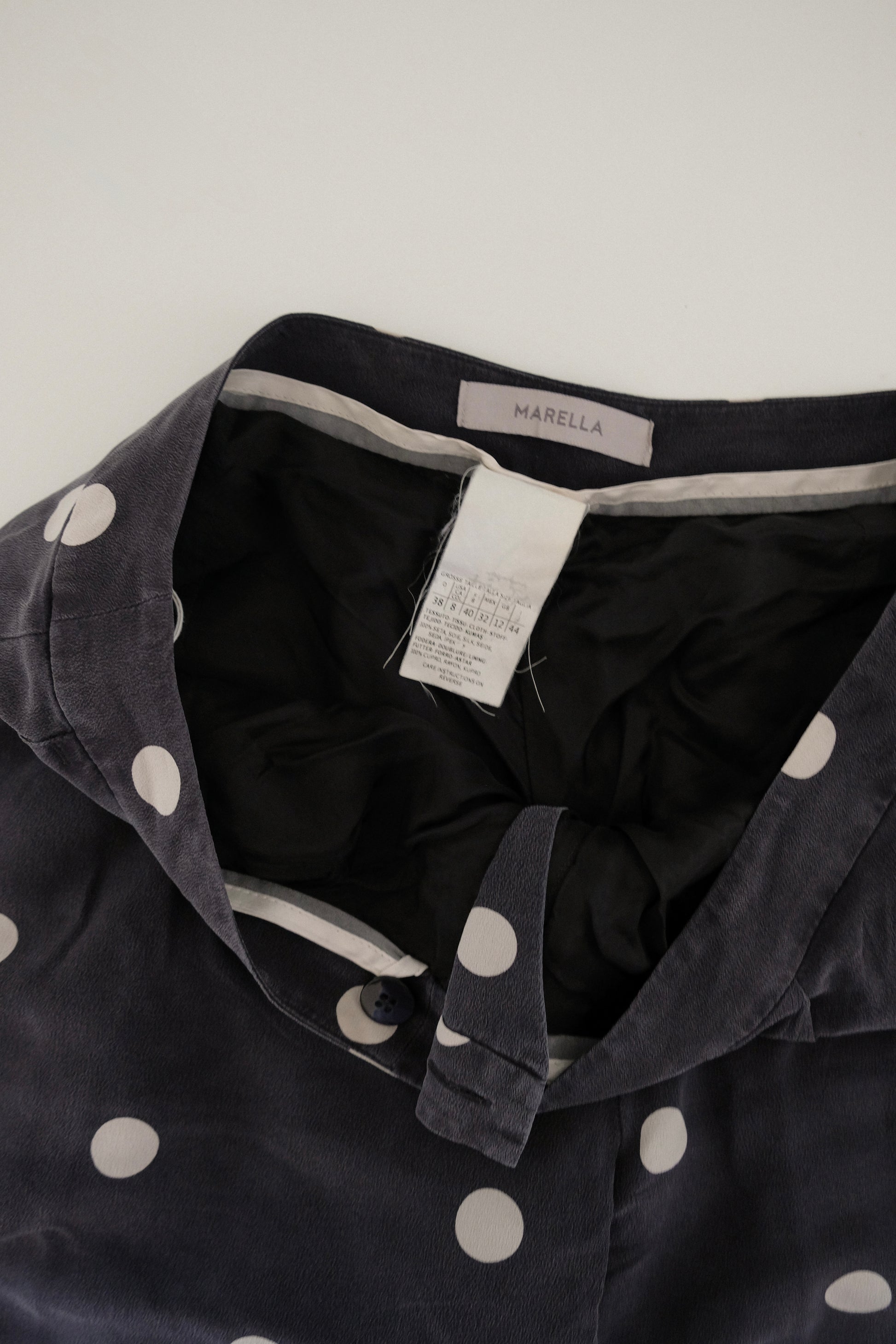 Effortlessly refined, these navy silk pants by Marella feature classic white polka dots for a timeless yet playful look. The fluid silhouette drapes beautifully, offering comfort with a polished finish. Perfect for both day and evening styling, they bring an easy elegance to any wardrobe.