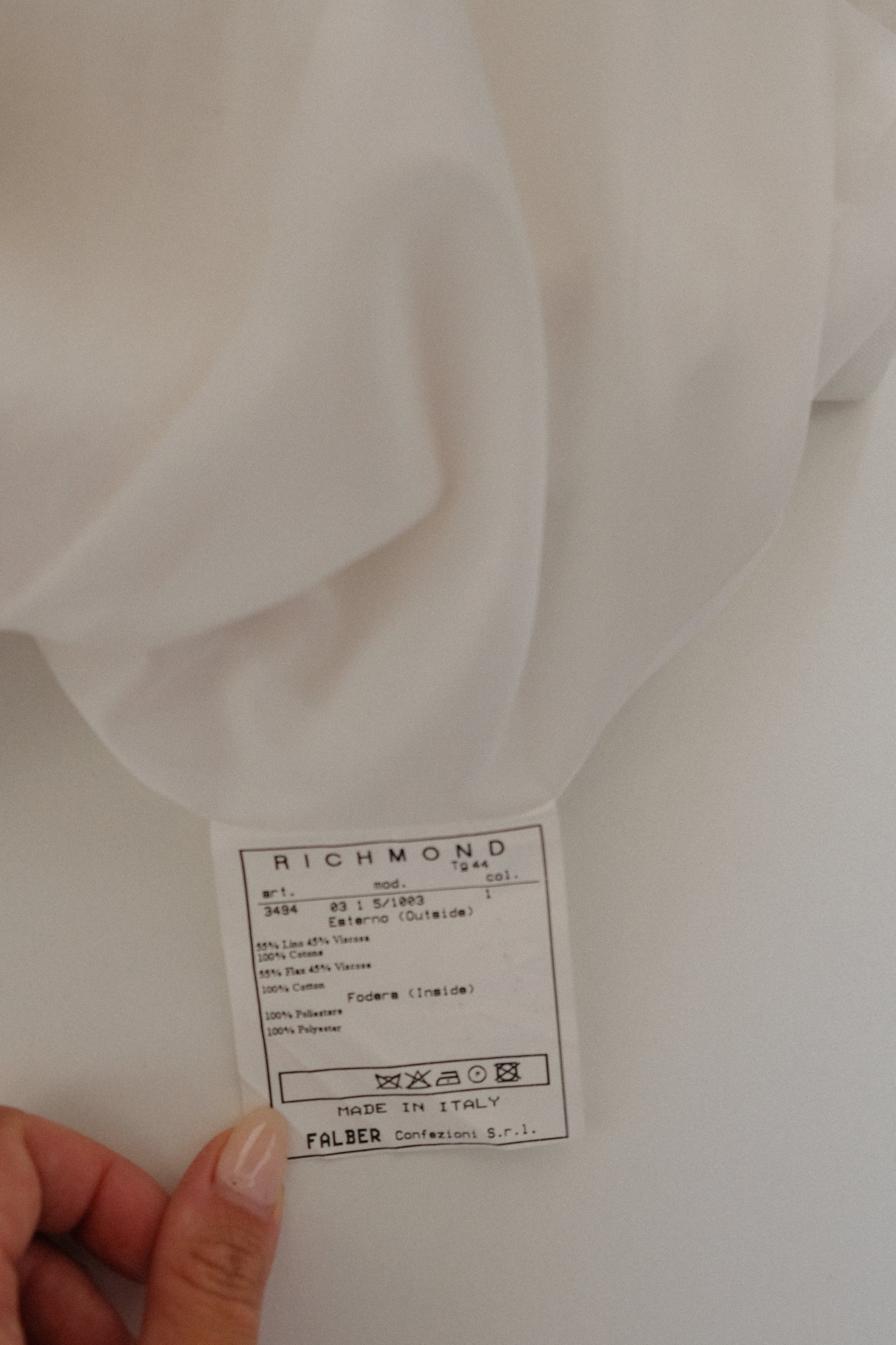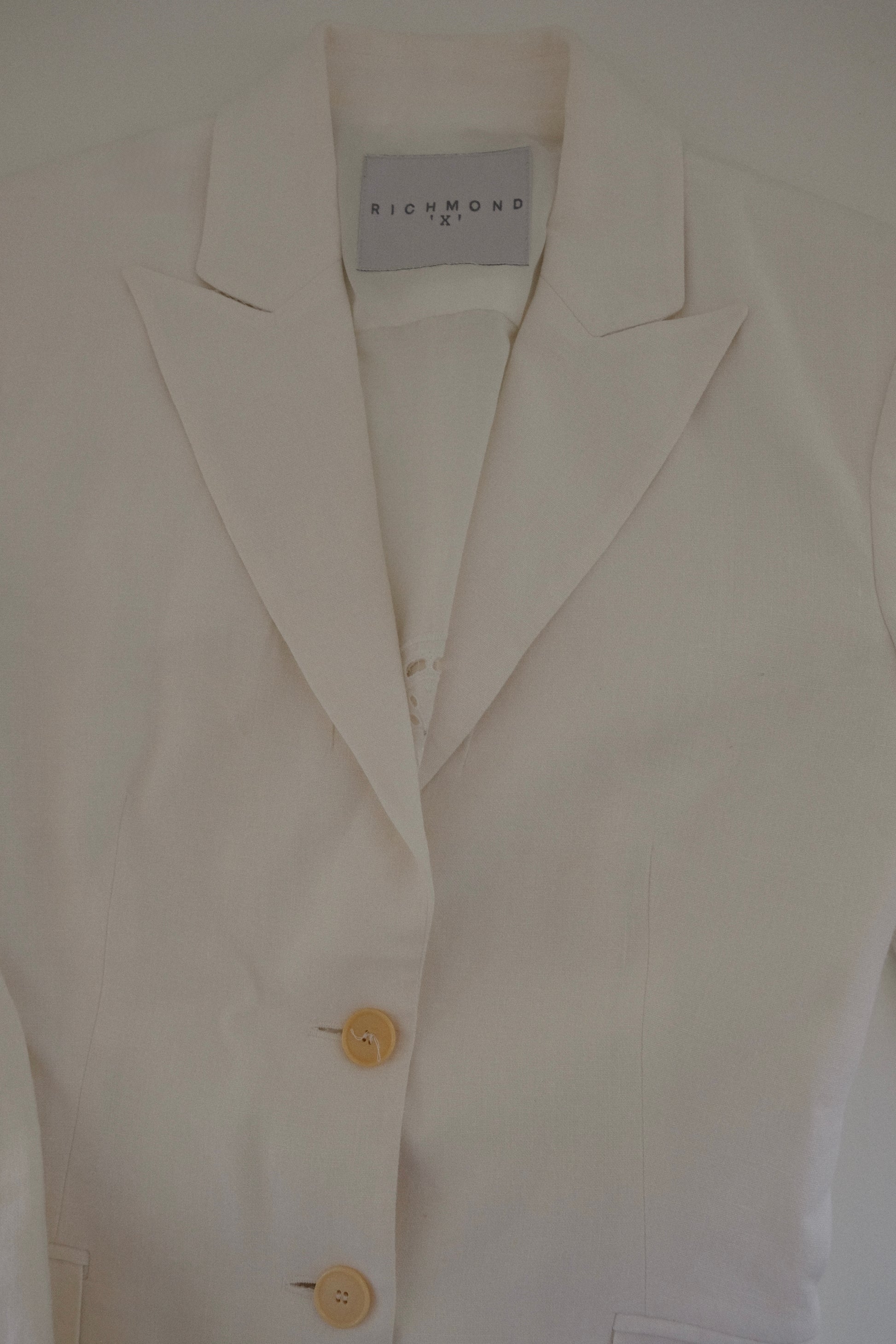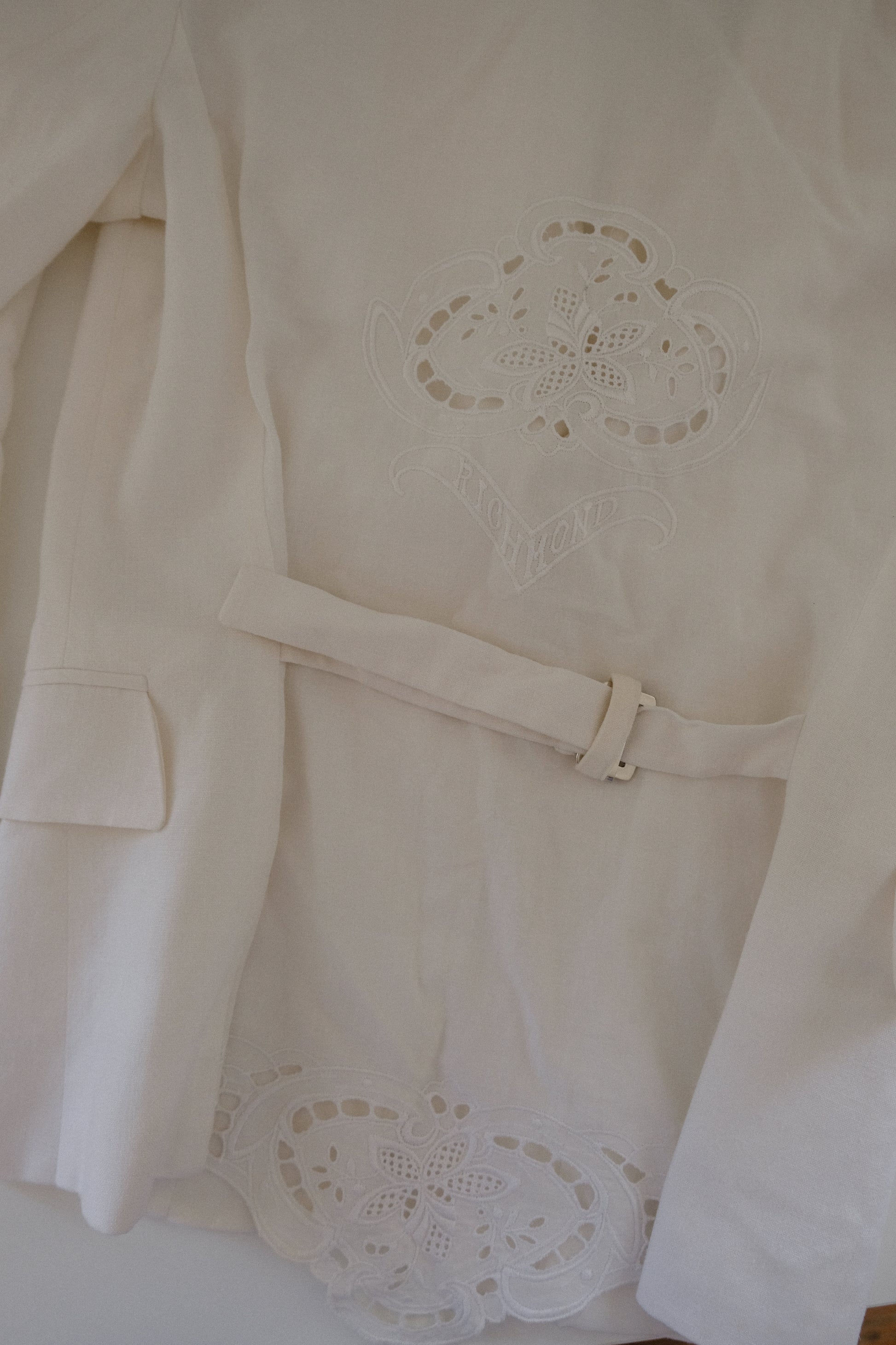Make a statement in this sophisticated white blazer by Richmond, featuring intricate embroidery on the back for a unique touch of artistry. Tailored to perfection, it combines classic structure with contemporary flair—ideal for elevating both professional and evening looks.