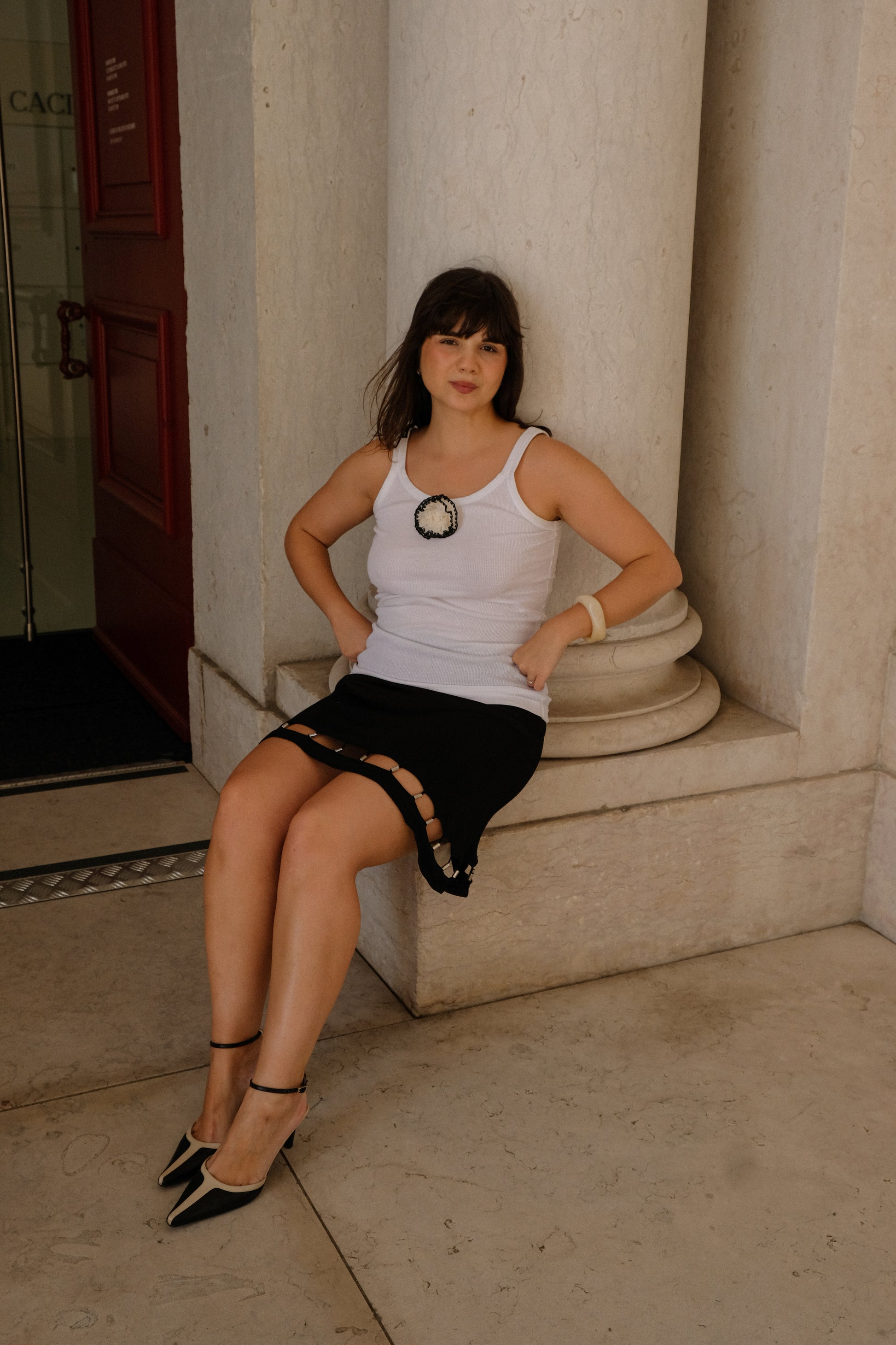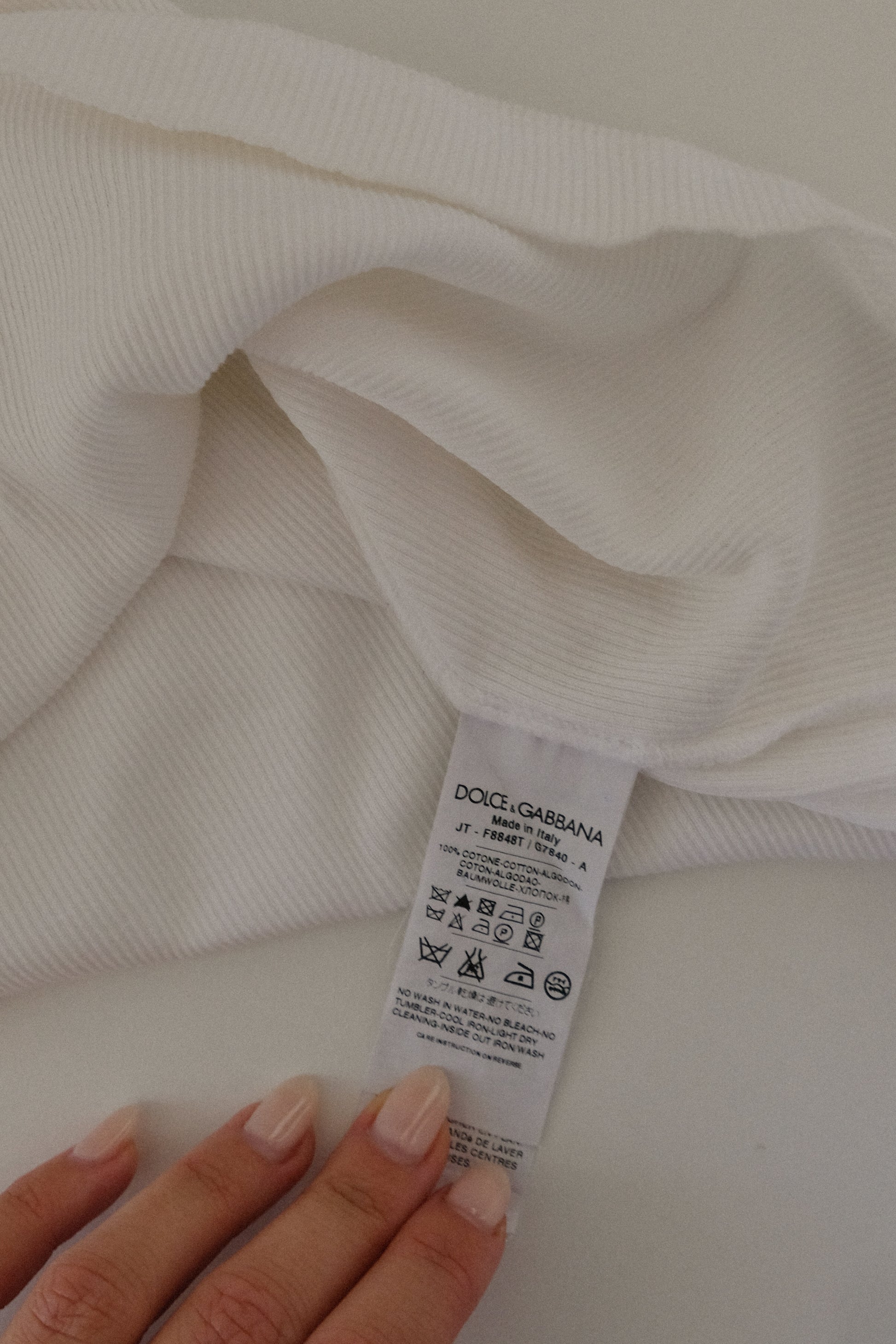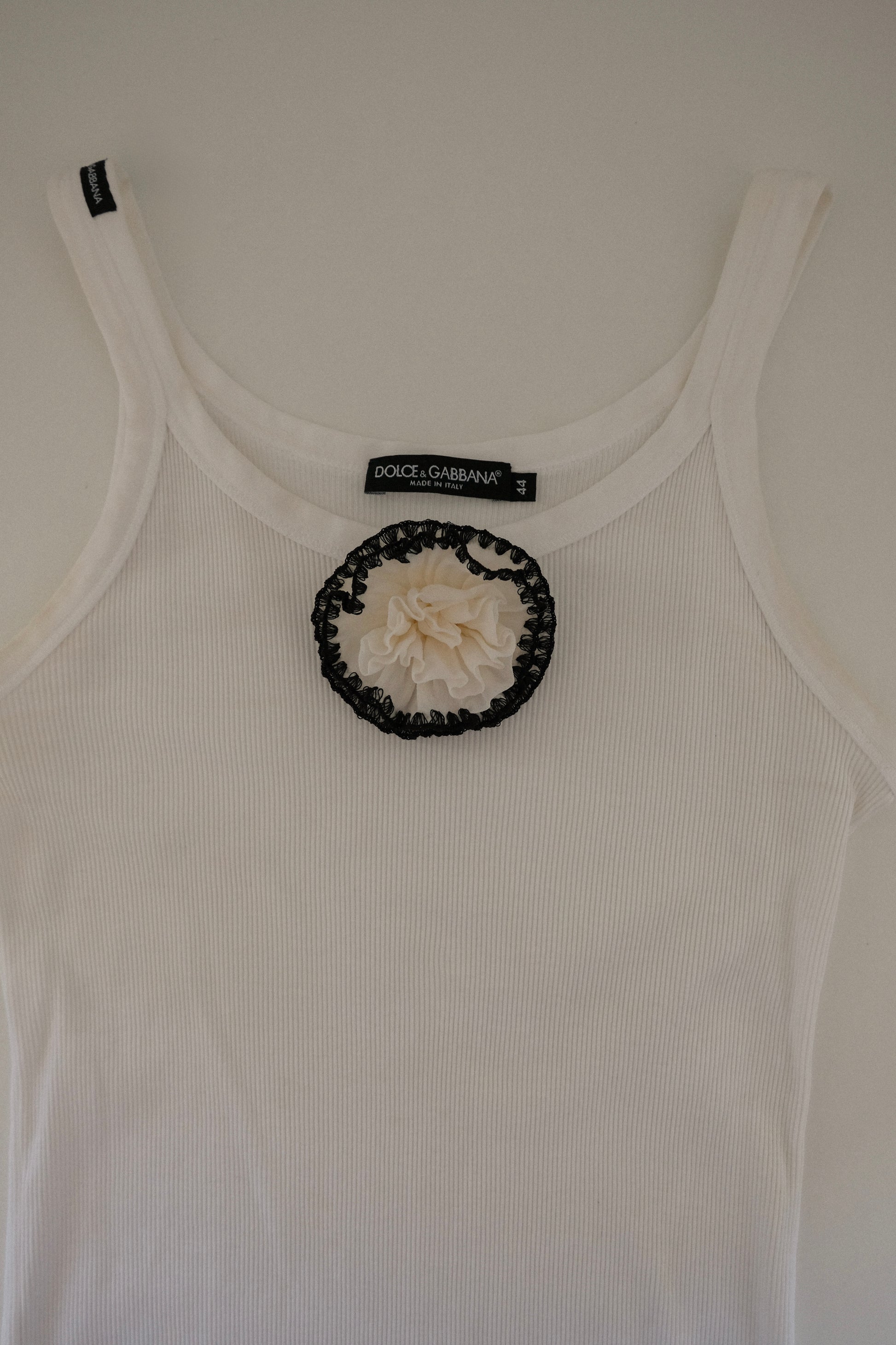 A classic reimagined—this white tank top from Dolce & Gabbana brings feminine charm to everyday style. Cut in a sleek, body-hugging silhouette, it’s finished with a delicate flower appliqué at the center for a touch of romantic flair. Effortlessly versatile, it's a fresh staple with signature D&G attitude.