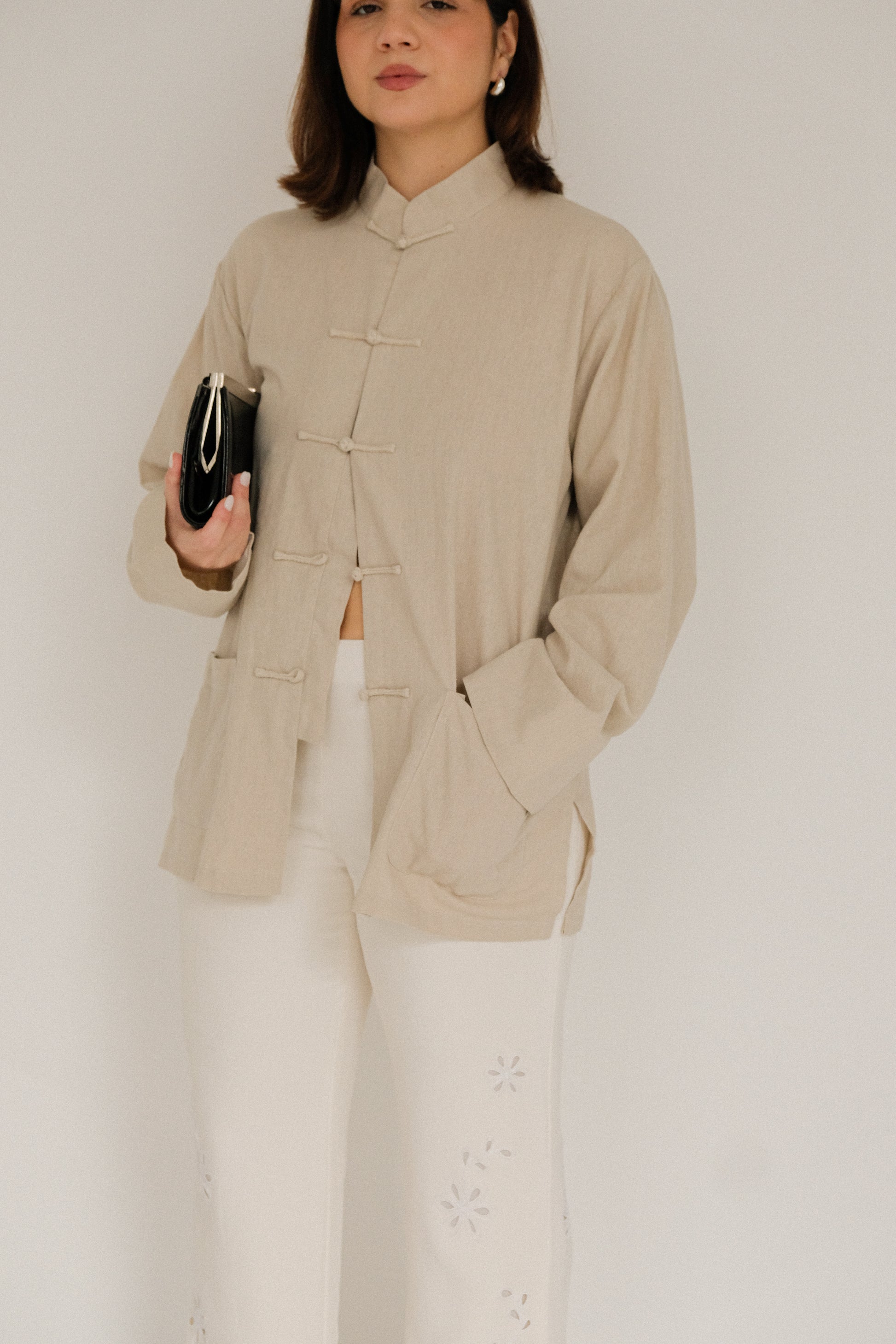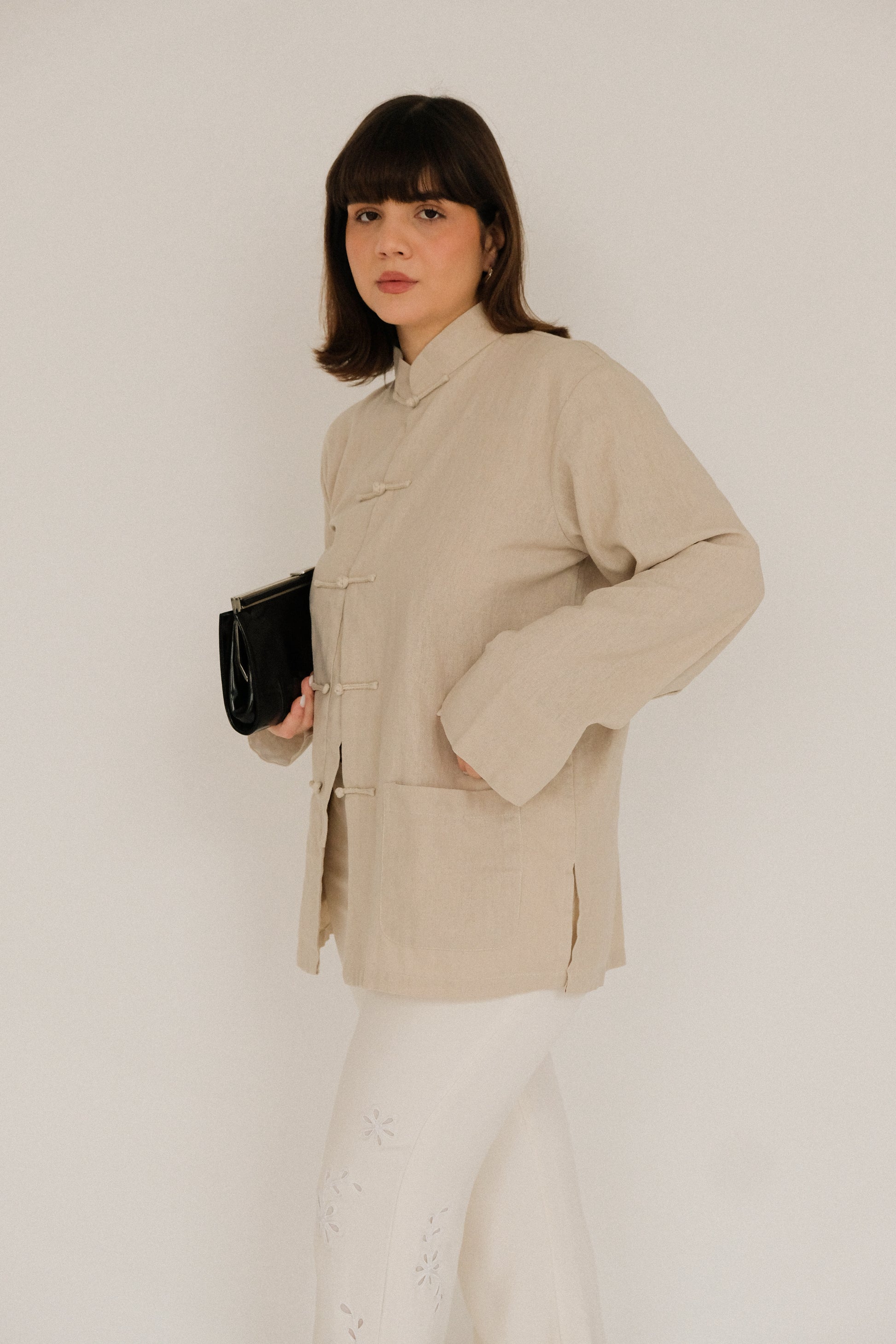 Shop this vintage Chinese-style blouse, beautifully adorned with intricate frog buttons. Inspired by traditional Chinese attire, this blouse blends cultural heritage with timeless elegance. Made from soft, breathable linen, this blouse offers comfort while remaining visually elegant.