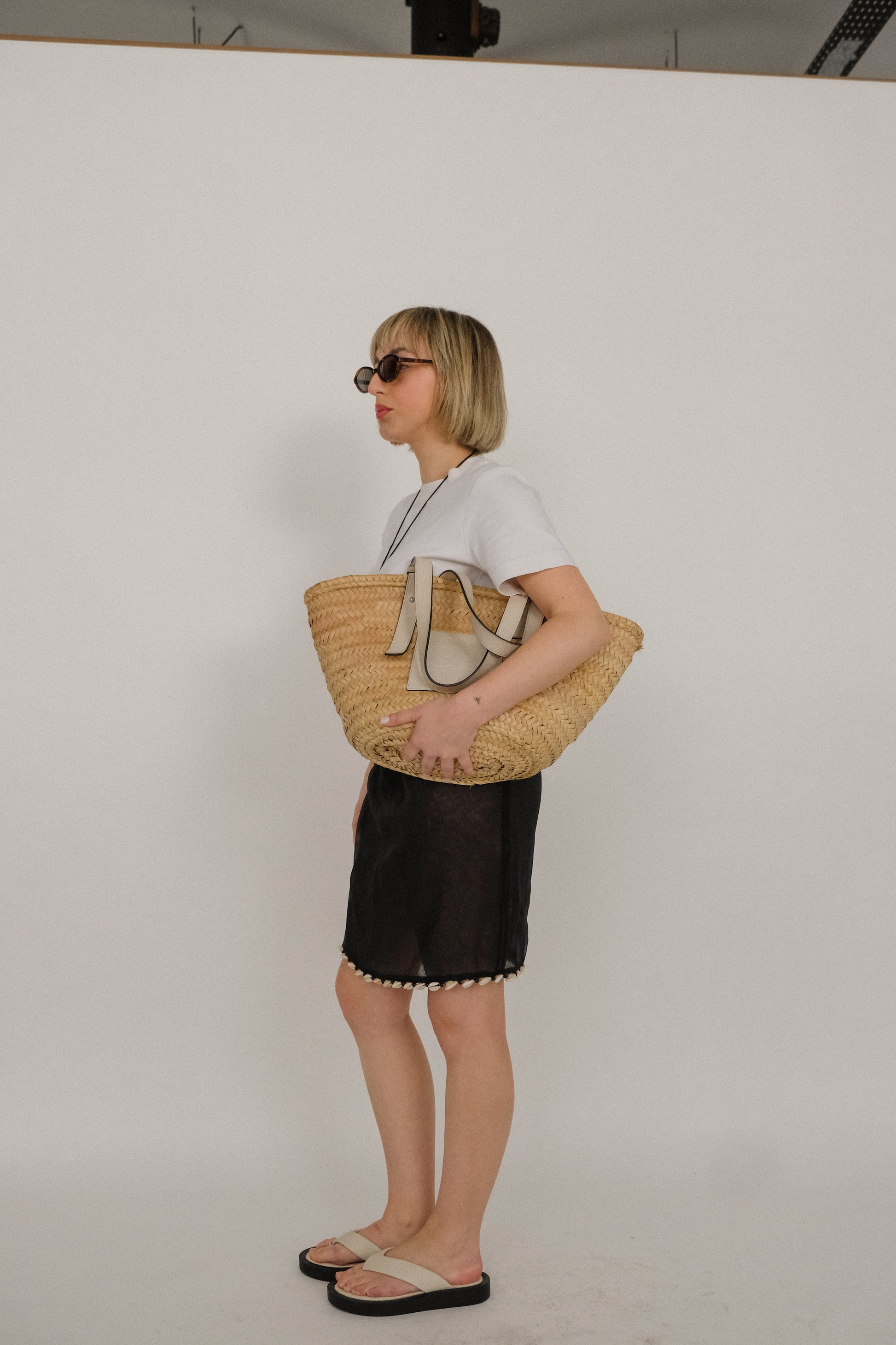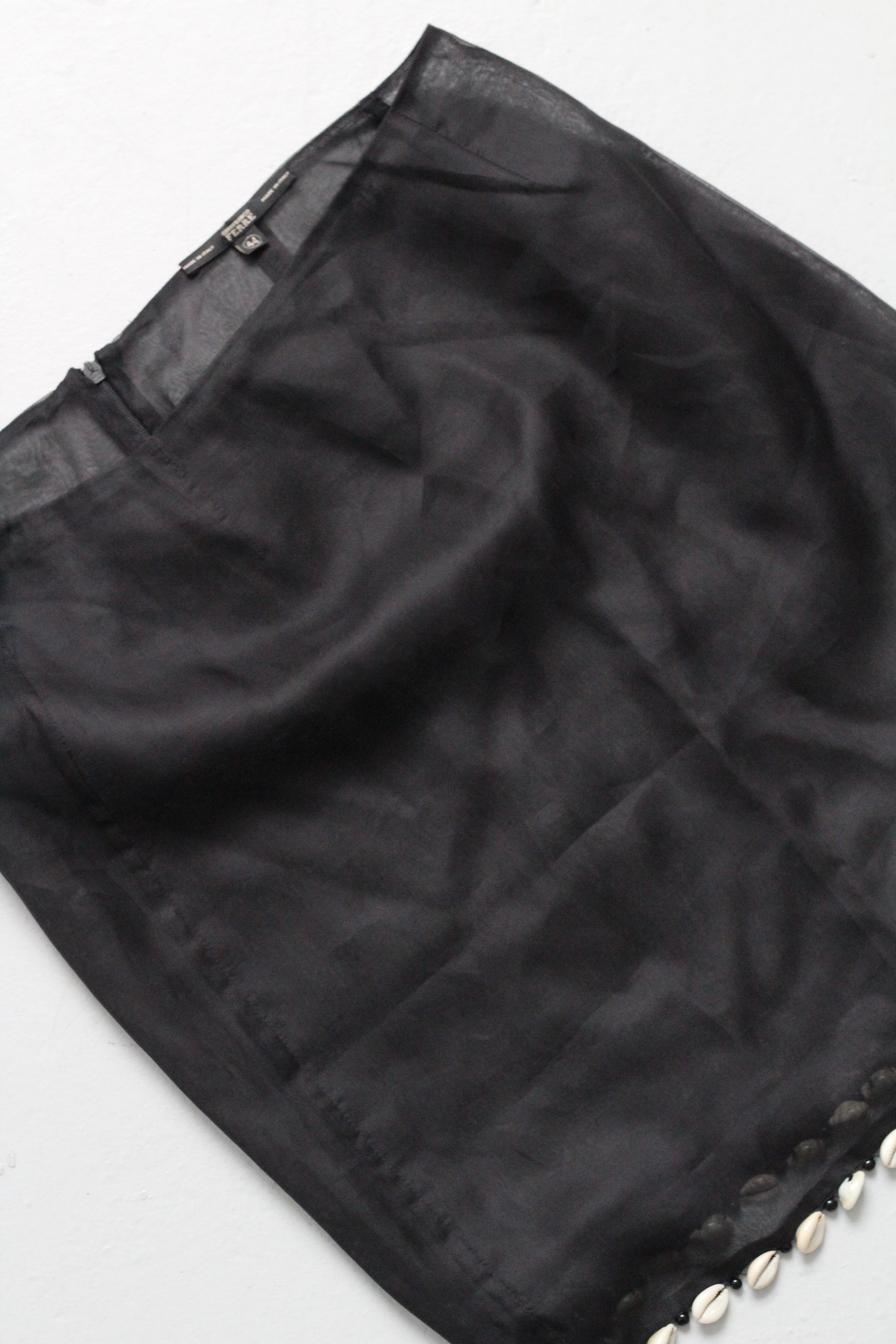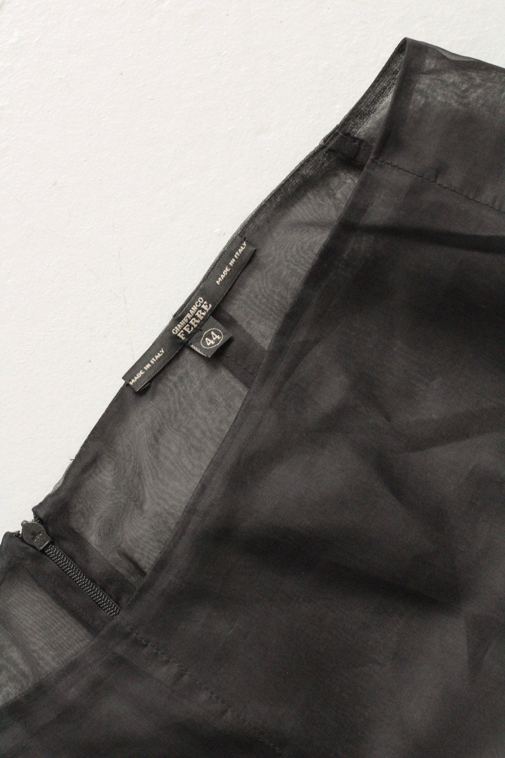 Channel the bold sophistication of Italian couture with this vintage Gianfranco Ferré skirt—a rare piece that reflects the designer’s signature fusion of architectural structure and sensual elegance. Crafted from fluid silk with a subtle sheer finish, this skirt is delicately embellished with charming shell details along the hem, making it the ultimate statement piece for summer styling.